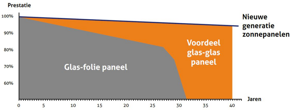 Wij gebruiken enkel Glas-Glas panelen !! Deze panelen bevatten geen kunststof. Glas is 100% bestand tegen UV-degradatie. Daarom hebben deze panelen een levensduur die op meer dan 40 jaar wordt geraamd.